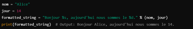 L’opérateur % permet de formater des strings en insérant des valeurs dans des espaces réservés. Plus précisément, « Bonjour %s! » % « monde » donne « Bonjour monde! ». Une sorte de modèle dans lequel vous pouvez insérer différents éléments.