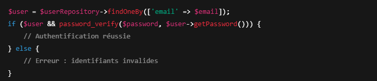 Voici un extrait de code de ce qui se passe en backend lorsqu’un utilisateur essaie de se connecter sur son espace personnel: