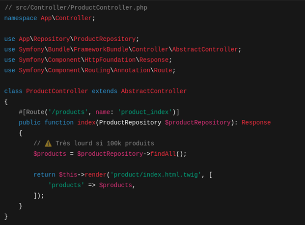 - On construit une requête (QueryBuilder) au lieu d’un findAll().