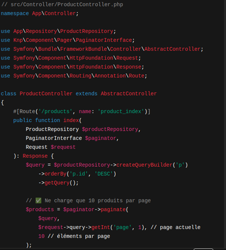 → Résultat : Grâce à Symfony et son intégration avec Doctrine, le problème de surcharge et d’affichage est résolu et la base renvoie à présent 10 éléments avec un affichage rapide et léger. Cela a permis d’optimiser les performances et d’améliorer l’expérience utilisateur.