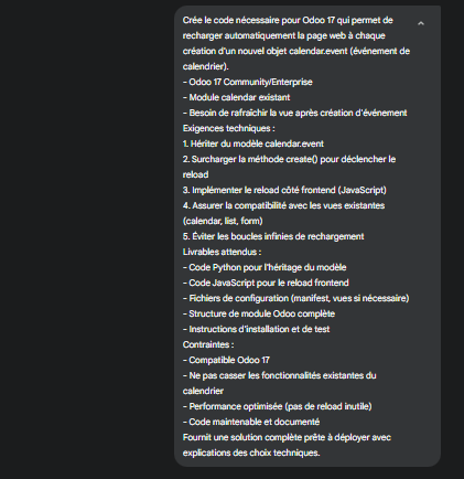 Il est important de noter que l’usage de l’intelligence artificielle varie d’un développeur à un autre et que son niveau de qualification et ses années d’expérience jouent un grand rôle dans leur choix. Deux IA ont souvent été mentionnées lors de nos échanges avec quelques développeurs Python travaillant sur des modules personnalisés Odoo: ChatGPT et Claude AI.
